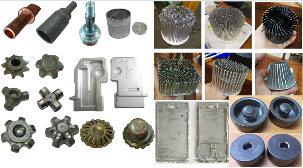 Examples include auto spare parts, LED radiators, cellphone casings, and various hardware tools.