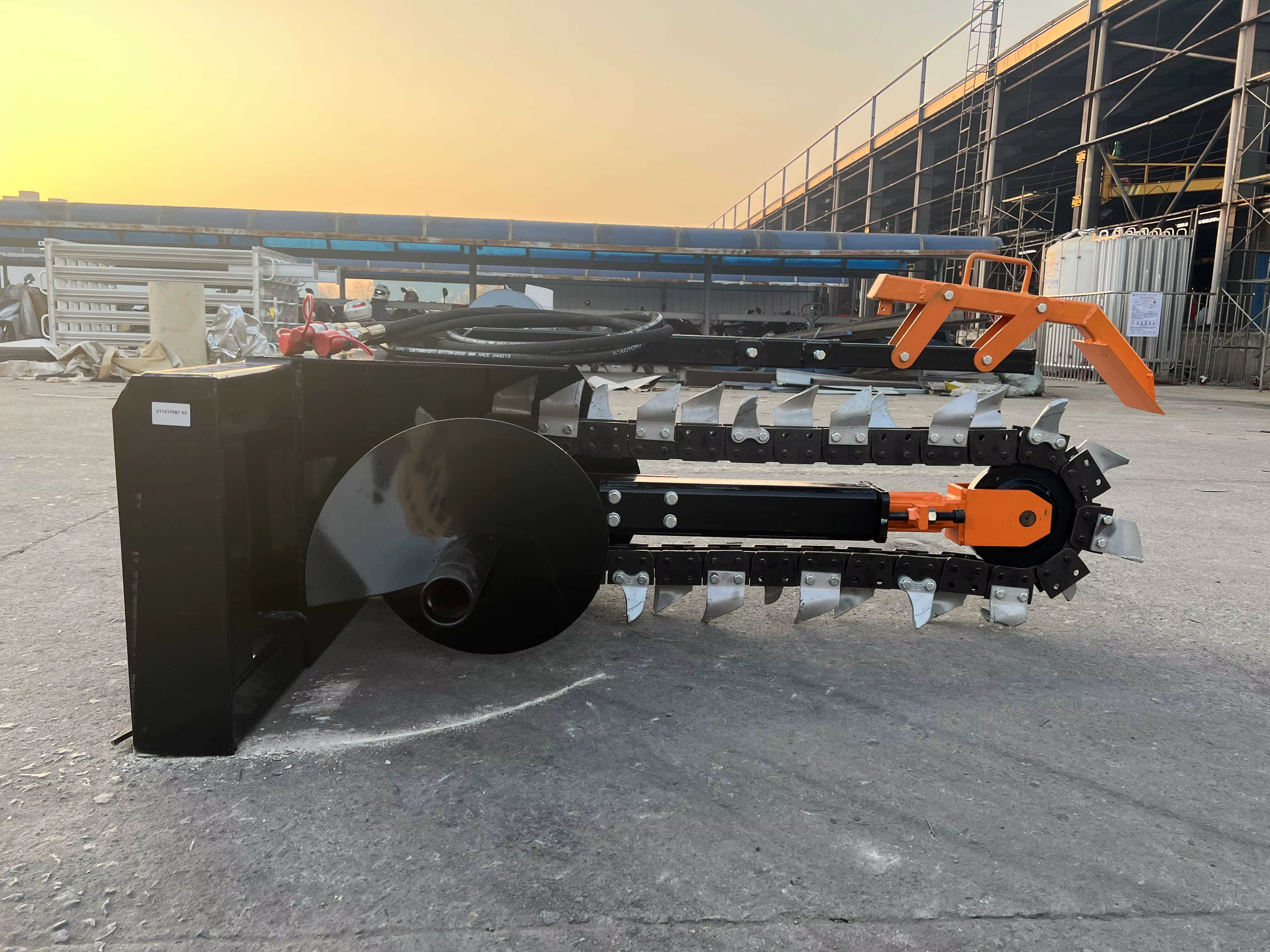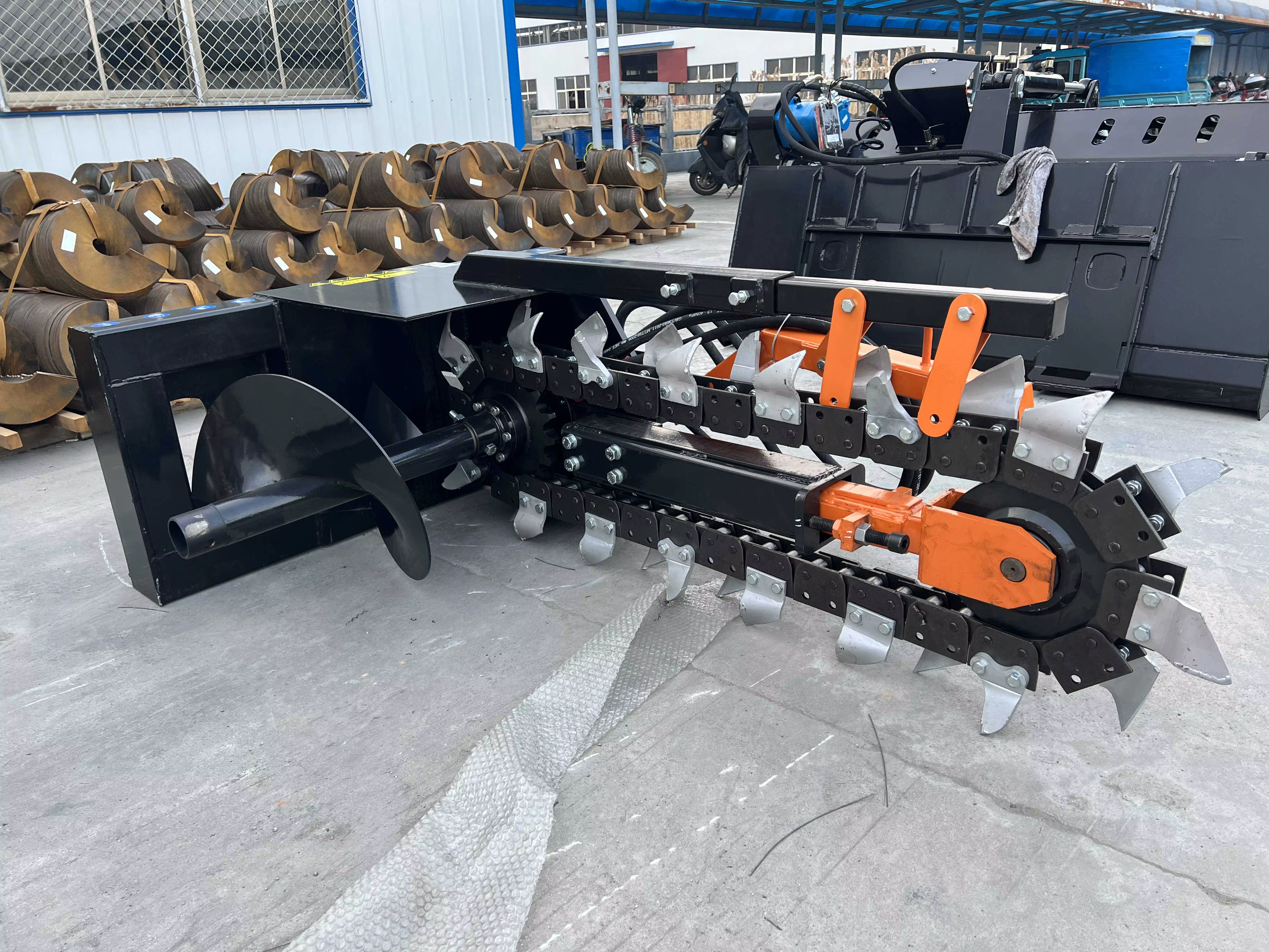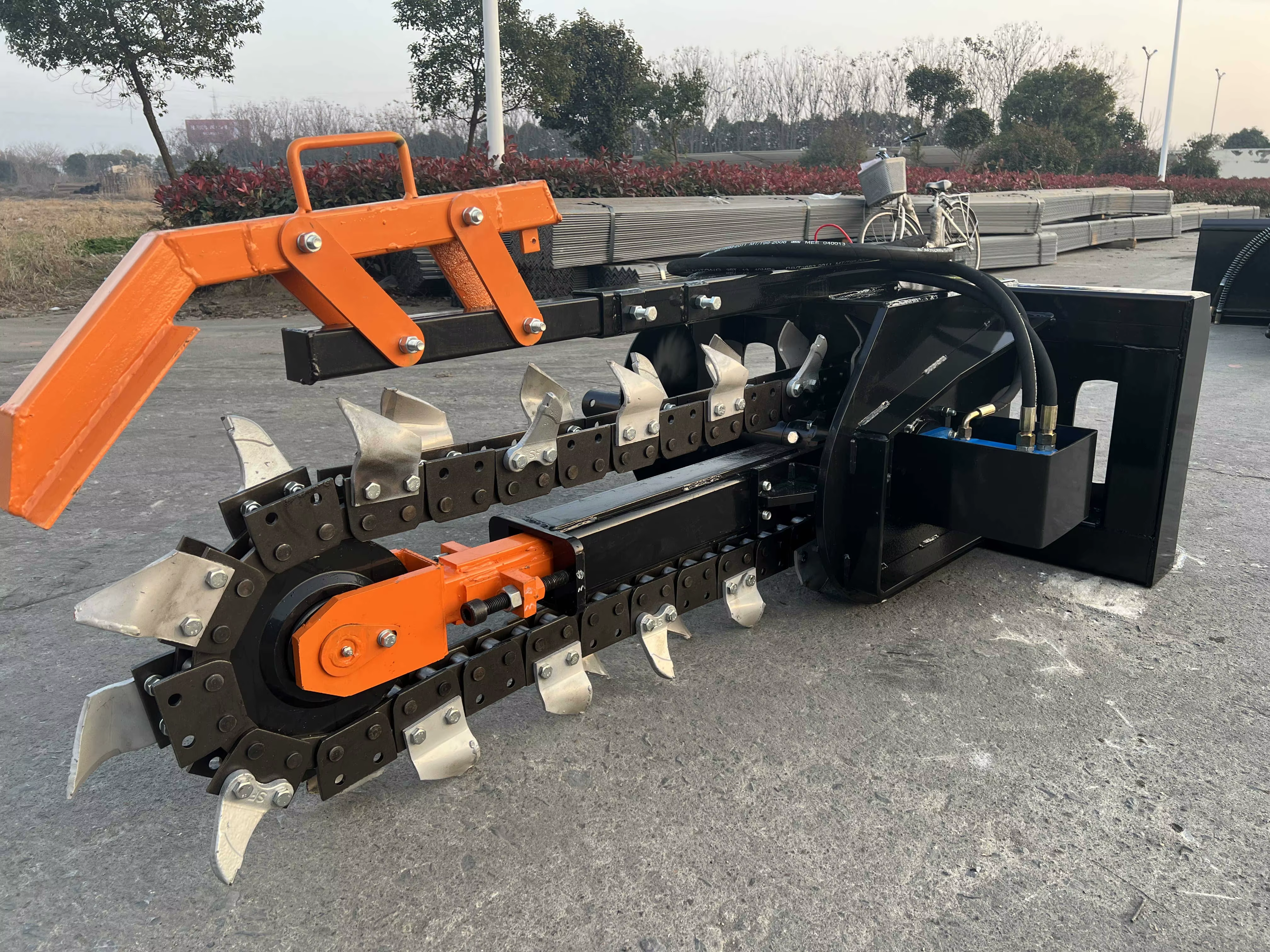 Key features include a powerful chain for effective ditching, compatibility with skid steers, long service life, and a lightweight design for better maneuverability.
