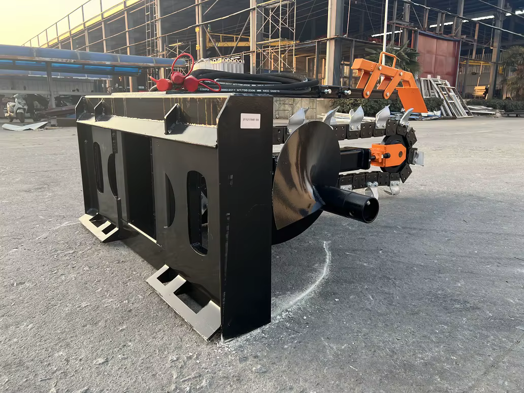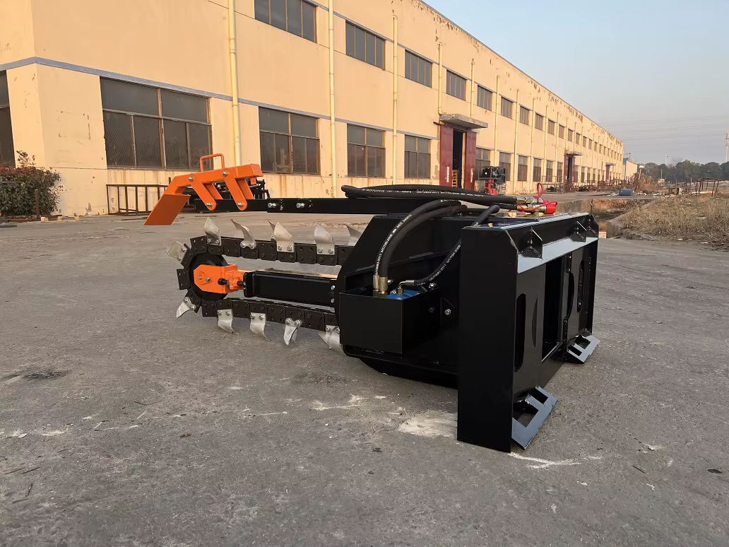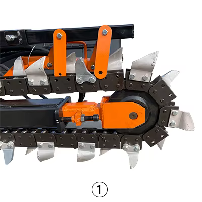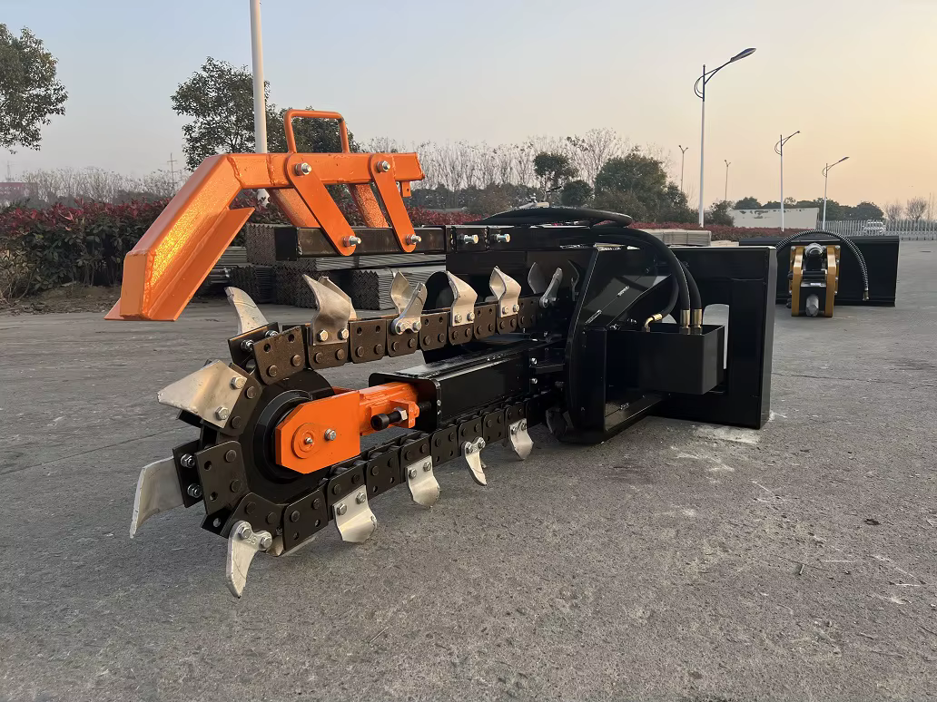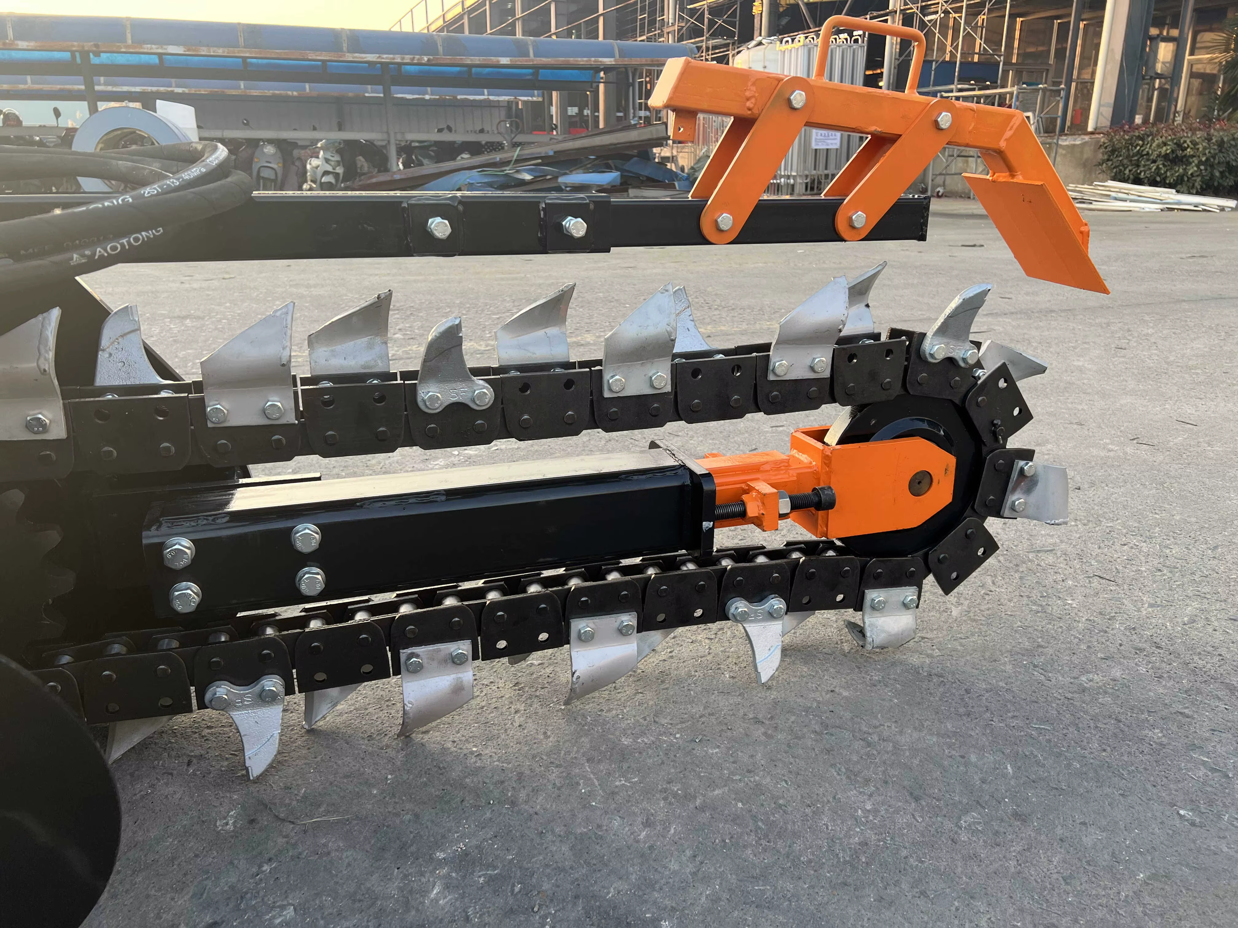 Key features include a powerful chain for effective ditching, compatibility with skid steers, long service life, and a lightweight design for better maneuverability.