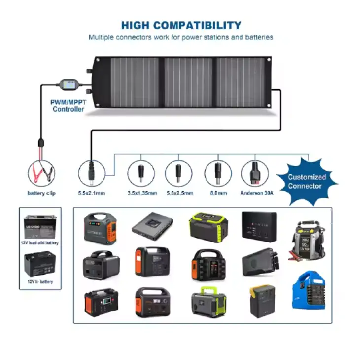 The solar panel charger is compatible with most mobile phones and devices, making it ideal for charging smartphones, tablets, and other portable electronics.