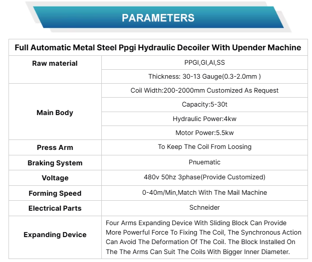 The decoiler is equipped with a 5.5kW motor powered by a PM250 steel gear reducer.