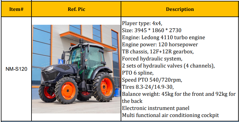 The NM-S120 4X4 Farm Tractor has a powerful 120-horsepower Ledong 4110 turbo engine.