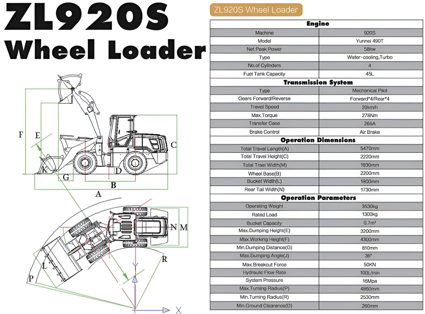 The 1.3 Ton Wheel Loader is equipped with a powerful 58 kW engine.