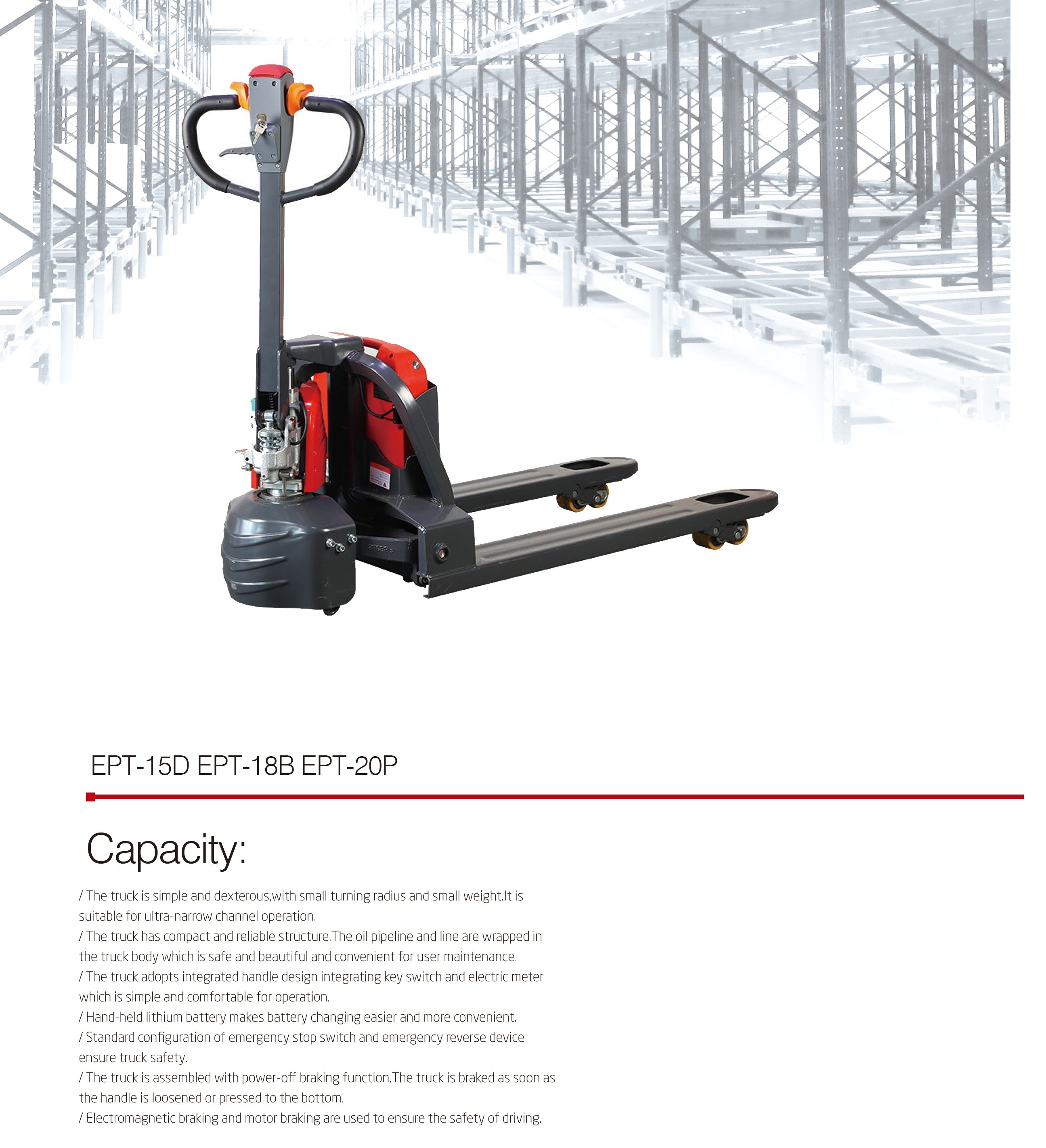 The pallet truck is equipped with safety features such as automatic braking, emergency stop buttons, and a horn to ensure safe operation.