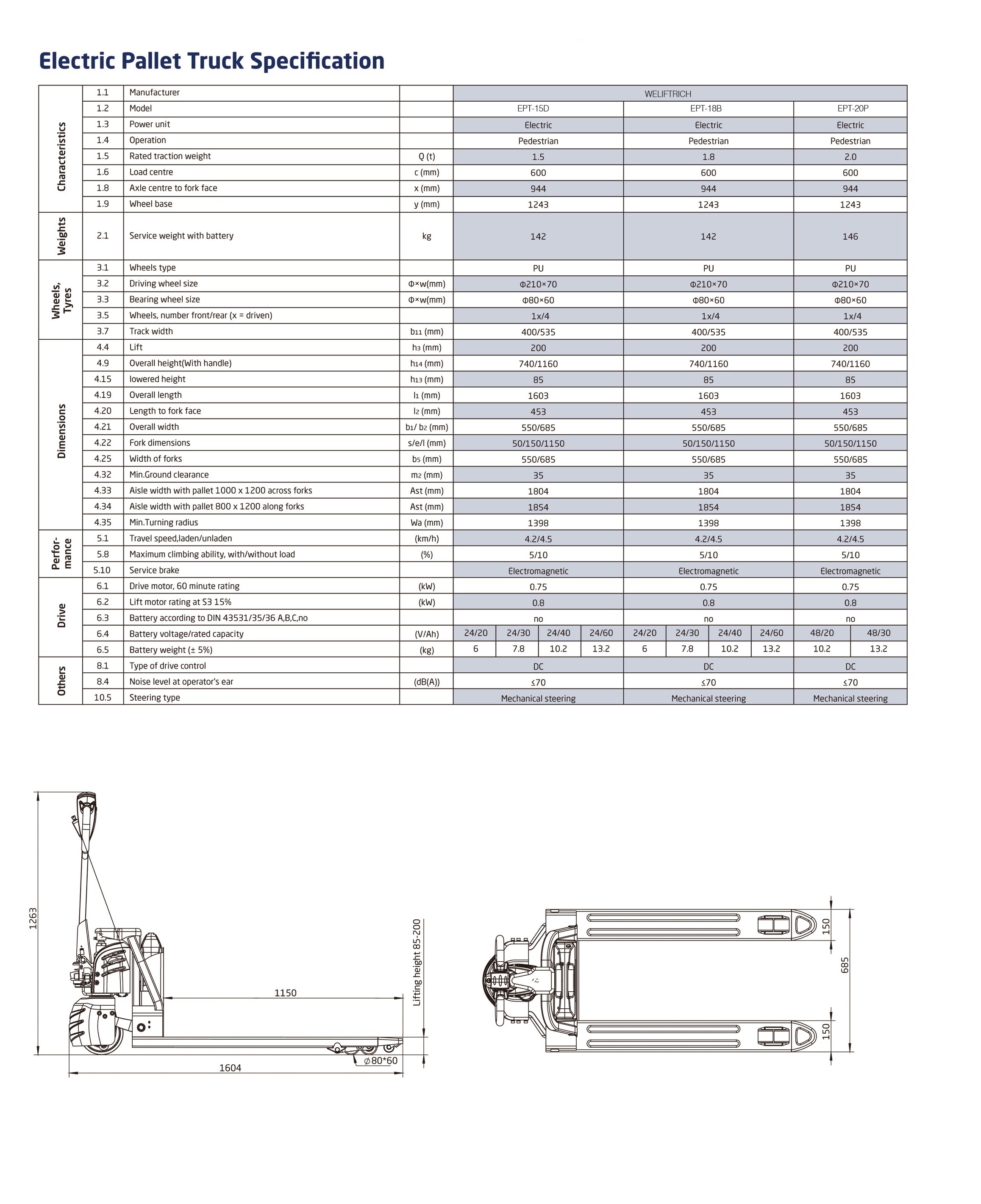 The 1.5 Ton Full Electric Pallet Truck has a weight capacity of 1500 kg, making it suitable for handling heavy loads in warehouses and distribution centers.