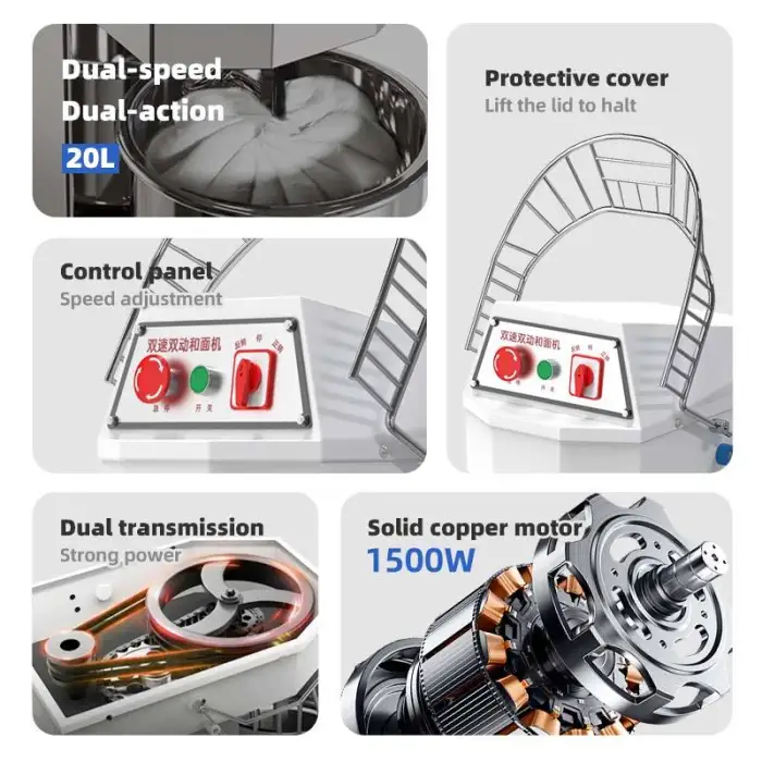 The 1500w 220v Vertical Dough Mixer features a powerful 1500W motor designed for efficient mixing.