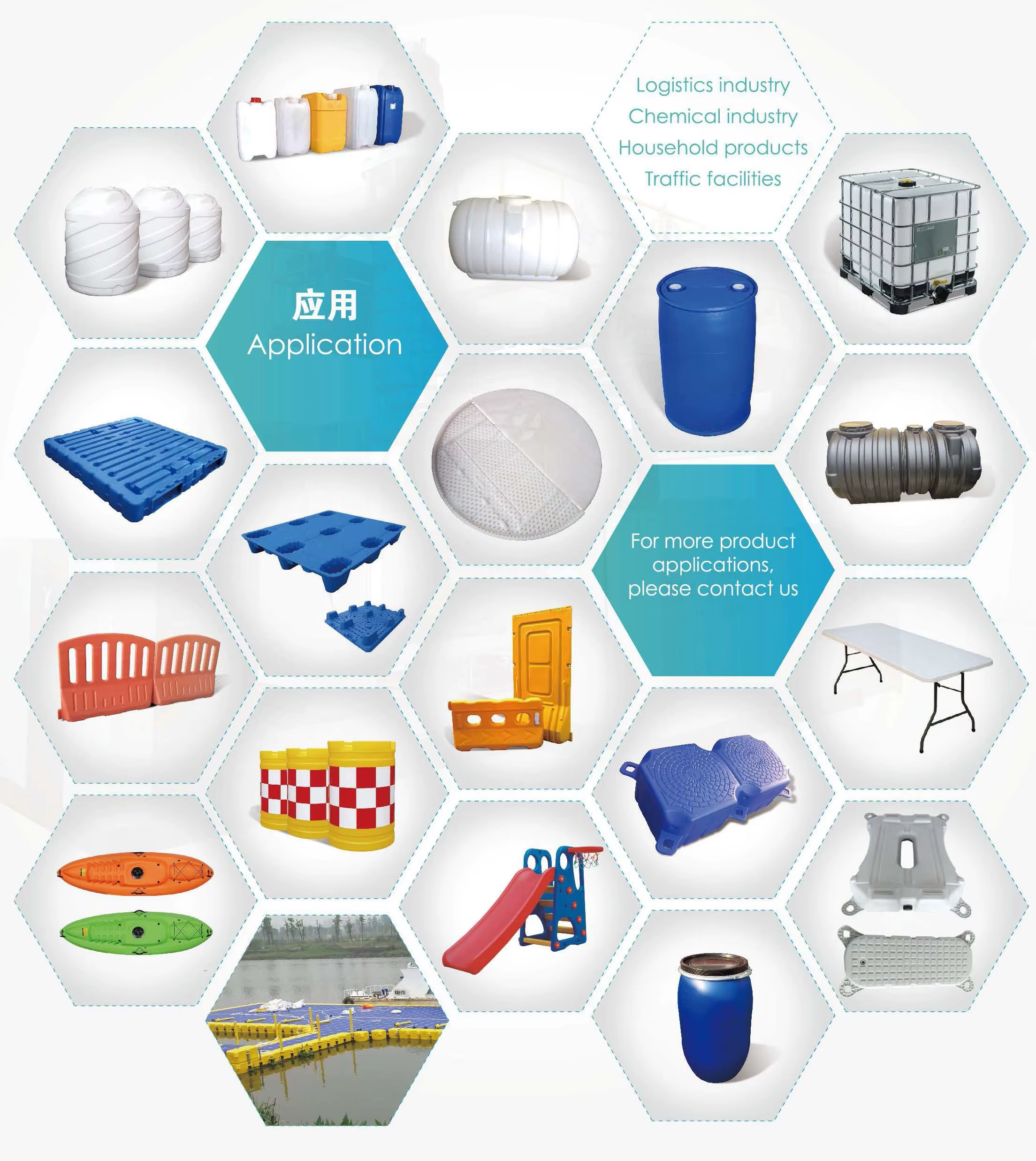 The machine is used for manufacturing five-layer water tanks for residential, agricultural, industrial, and water treatment applications.