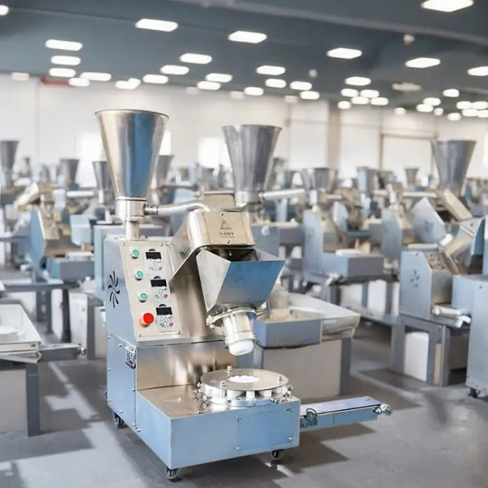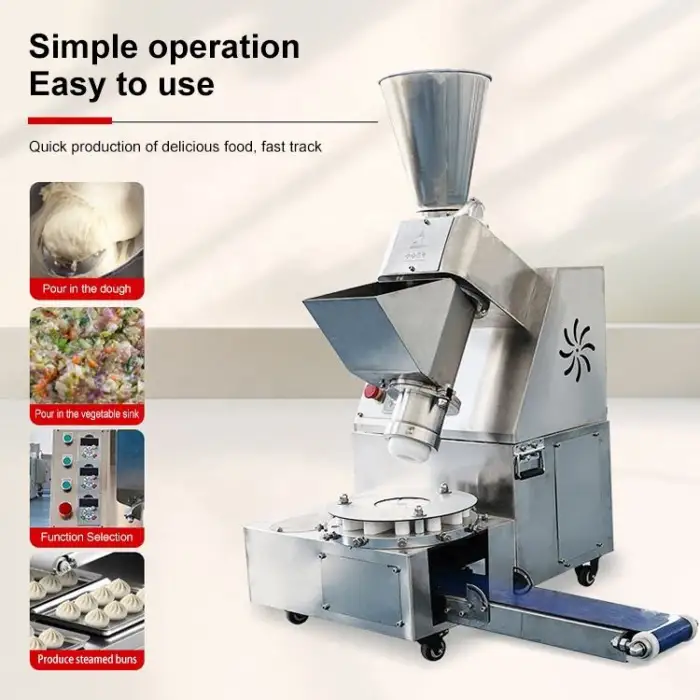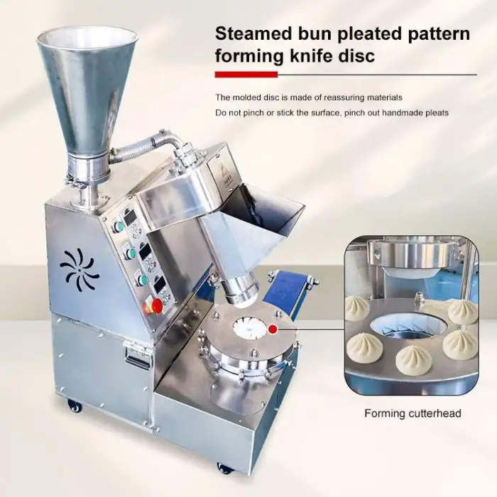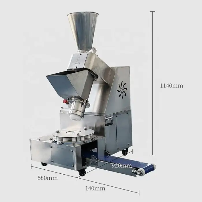 The 220V 1kW Automatic Dough Encrusting Machine Kubba Maker can make a variety of stuffed buns including Nepali momo, baozi, bao pow, and steamed stuffed buns.