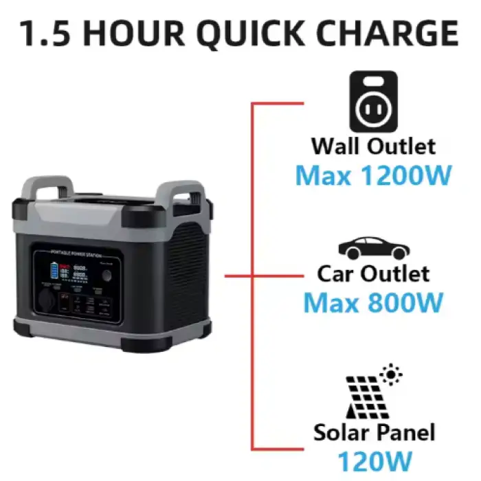 You can charge the power station using a household electricity outlet, car charger, or solar panel.