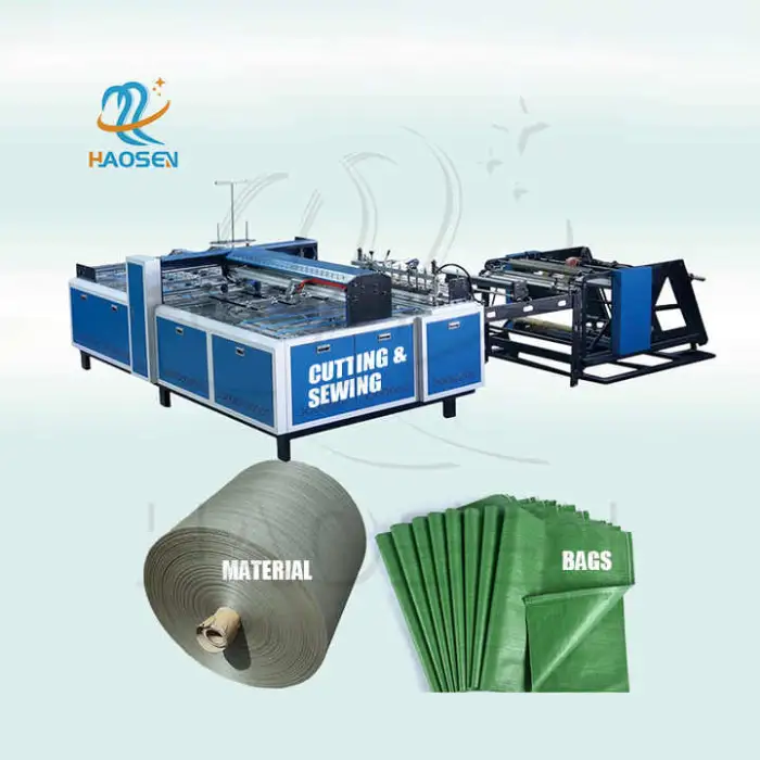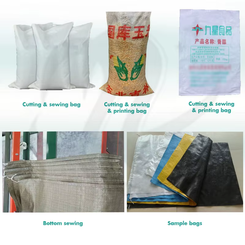 The machine can produce various types of woven bags including fruit bags, rice bags, PP woven bags, and cement bags.