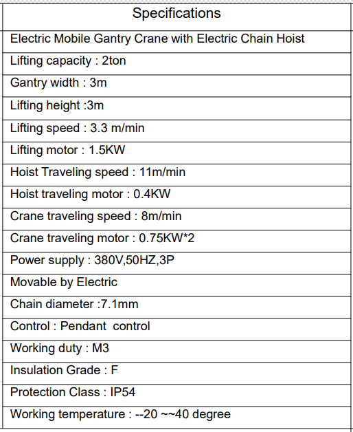2ton Electric Mobile Gantry Crane with Electric Chain Hoist (3X3M)