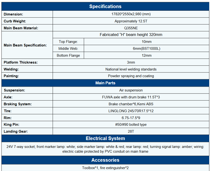 The dimensions of the trailer vary, but it typically measures approximately 13.6 meters in length, 2.5 meters in width, and 3.5 meters in height.