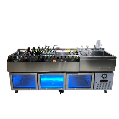 The slanted speed rack is designed to hold up to 12 liters of ingredients, providing quick access to commonly used bottles while maximizing space efficiency.