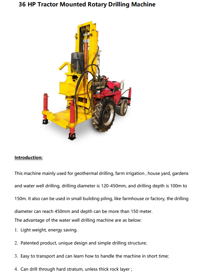 1. What is the horsepower of the 36 HP Tractor Mounted Rotary Drilling Machine?
