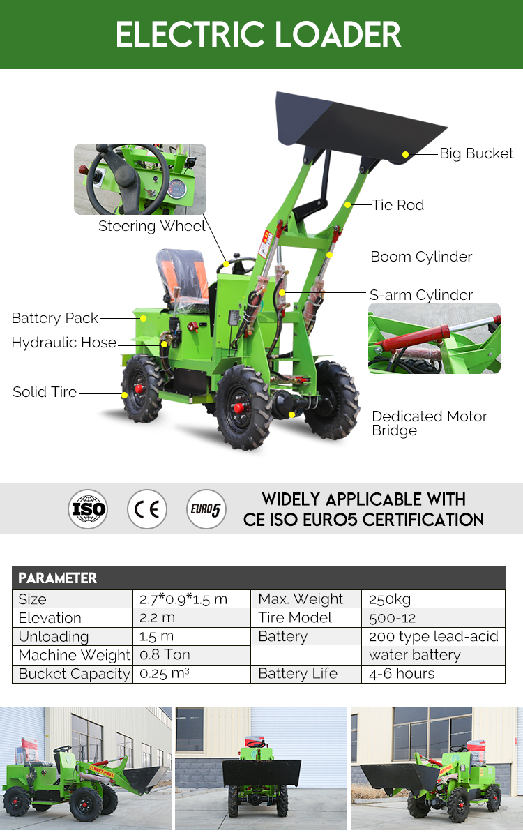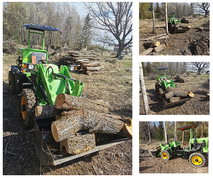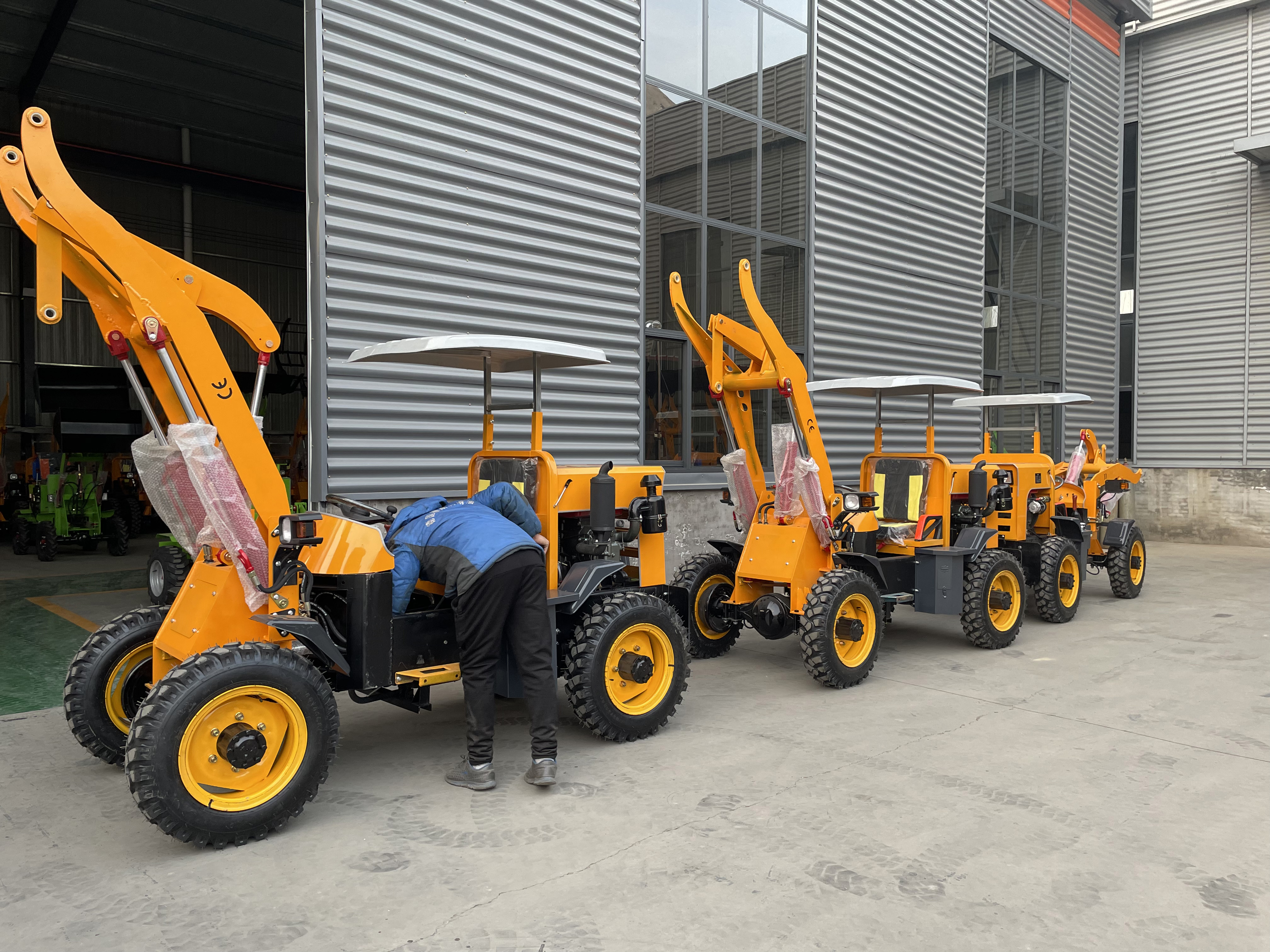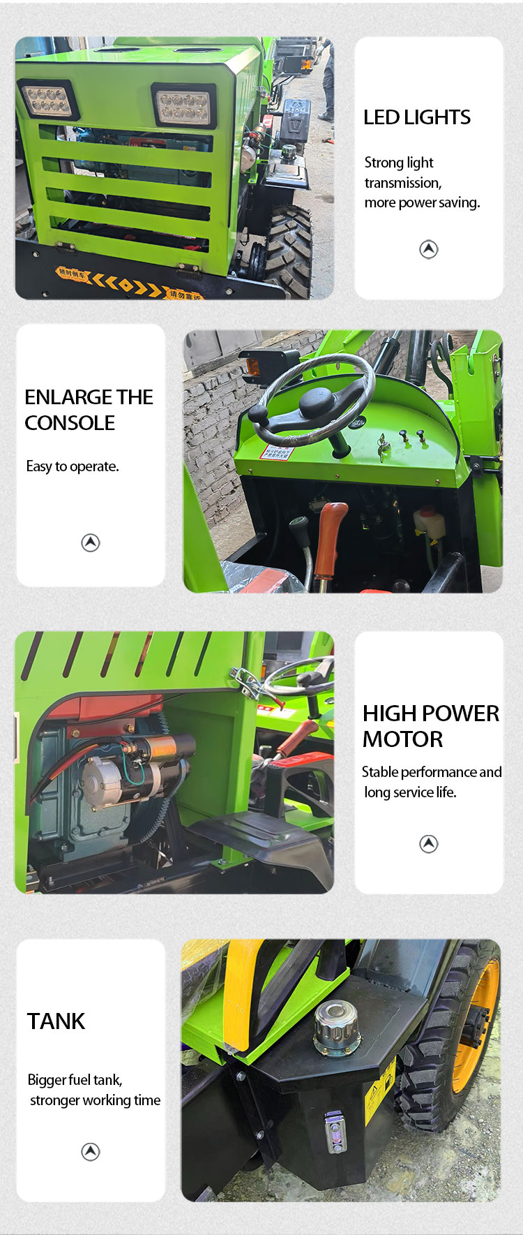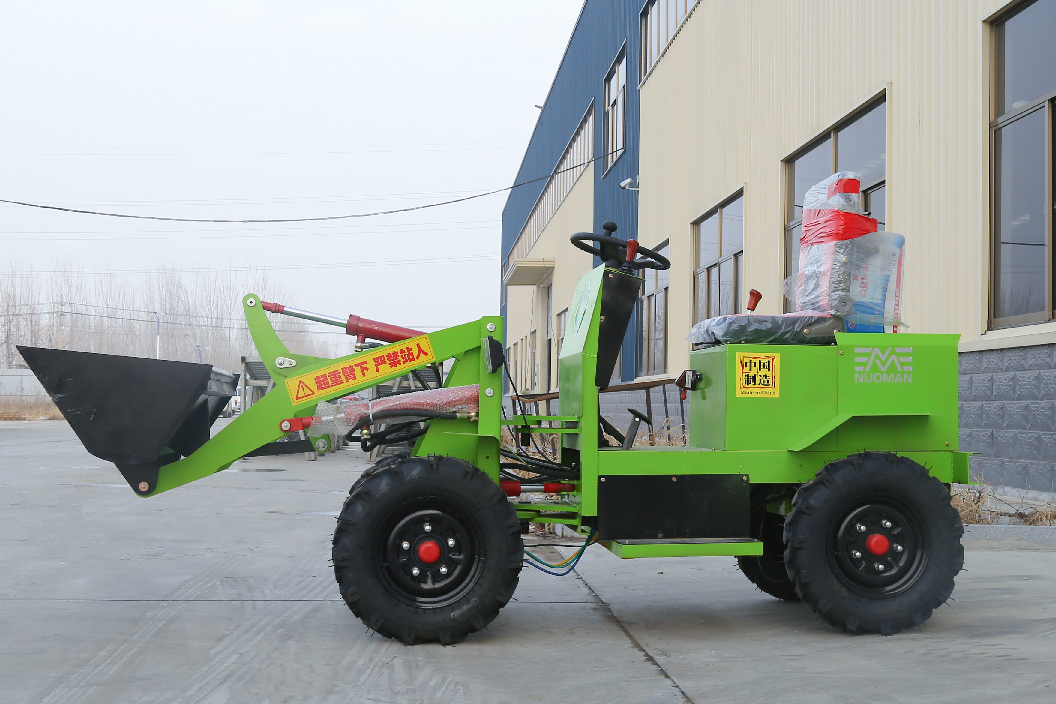 The Mini Front End Loader utilizes a hydrostatic four-wheel drive system, providing excellent traction and stability on various terrains.