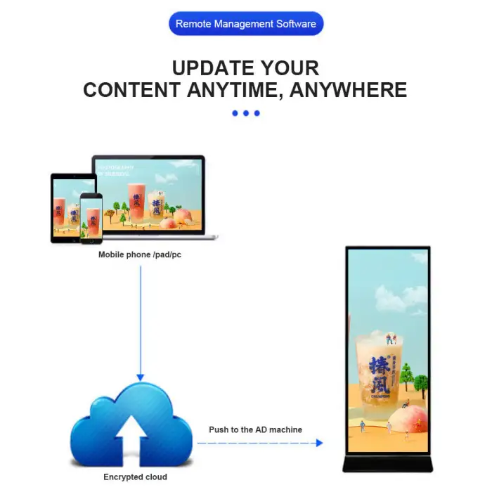 The Vertical Advertising Machine is available in three sizes: 55 inches, 65 inches, and 75 inches.