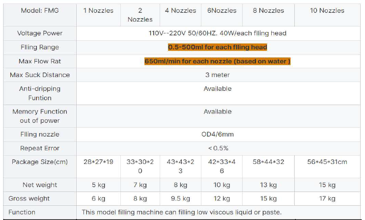 The 6 Nozzles Semi-automatic Filling Machine can handle a variety of liquids including water, oils, sauces, and other non-viscous to medium-viscous liquids. Always check compatibility with specific products.