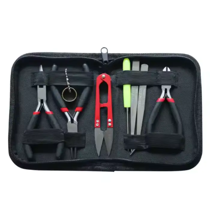 The kit includes essential tools for jewelry making such as round nose pliers, side cutting pliers, scissors, and a vernier tape measure, among other items, depending on whether you choose the 8pcs or 12pcs set.