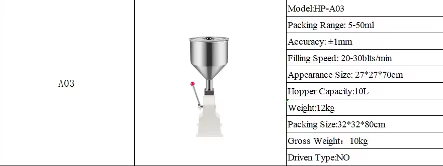 The A03 Liquid Filling Machine sldb is a compact, high-precision filling machine designed to accurately dispense liquids into bottles, jars, vials or pouches. It is suitable for food, beverage, cosmetic, chemical and pharmaceutical lines and is available in configurable semi-automatic or fully automatic versions.