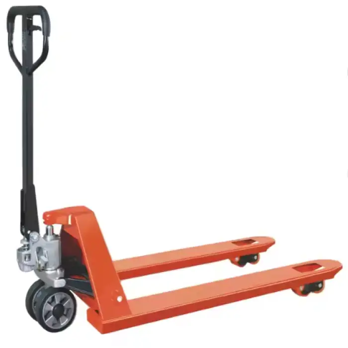 The pallet truck is equipped with durable nylon PU wheels for smooth movement.