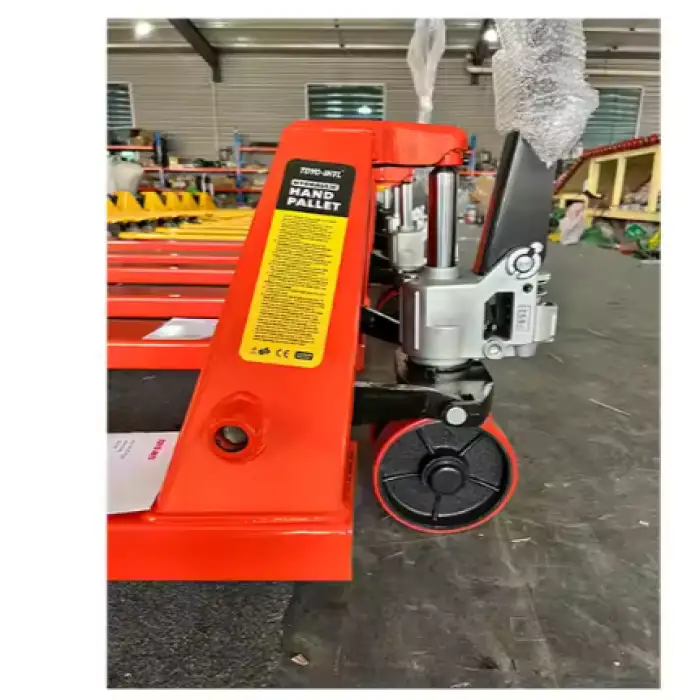 The use of high-quality materials, including nylon PU wheels and a sturdy frame, contributes to the durability of the pallet truck.
