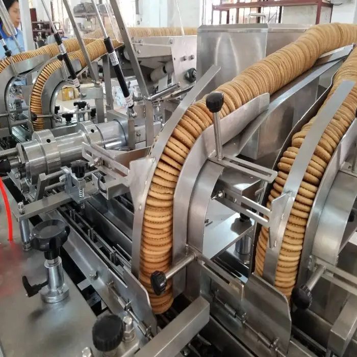 The machine is primarily designed for producing chocolate cream biscuits but can also be adapted for various biscuit varieties.