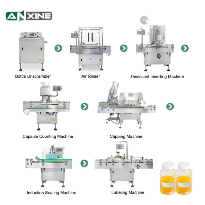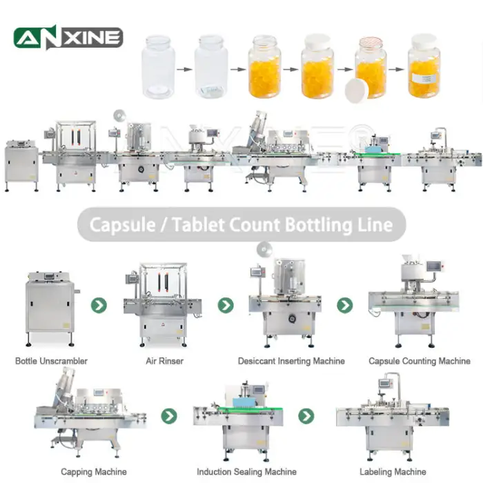 The ANXINE High Precision Fully Automatic Counting Line can handle tablets, capsules, pills, and candies.