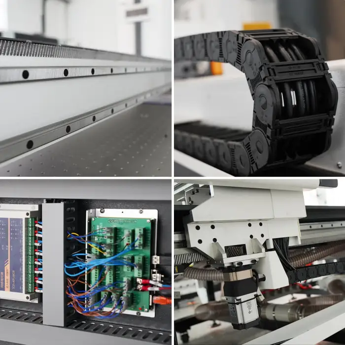 The AOL Mini Cloth Cutting Machine utilizes a servo drive system with HIWIN linear guides, a synchronous belt, and a ball screw for smooth operation.