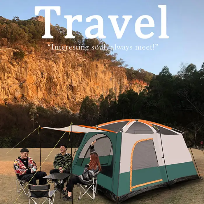 The tent features a structure with two bedrooms and one living room, providing a spacious and comfortable environment.