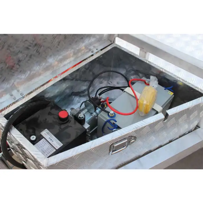 The trailer can be lifted using a hydraulic manual lift, hydraulic remote control lift, or a ramp.