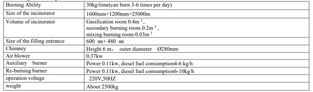 The incinerator has a burning capacity of 30 KG per hour and can operate 3 to 6 times per day.