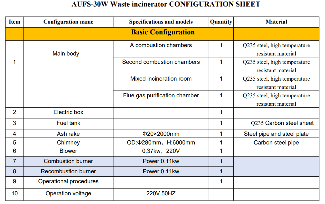 The AUFS-30W Waste Incinerator can process raw waste including Blake bags, plastics, paper, and vegetable waste.