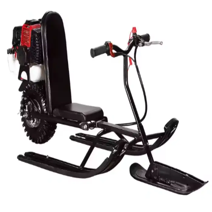 The snowmobile features a 49cc 2-stroke GY6 air-cooled single-cylinder engine.