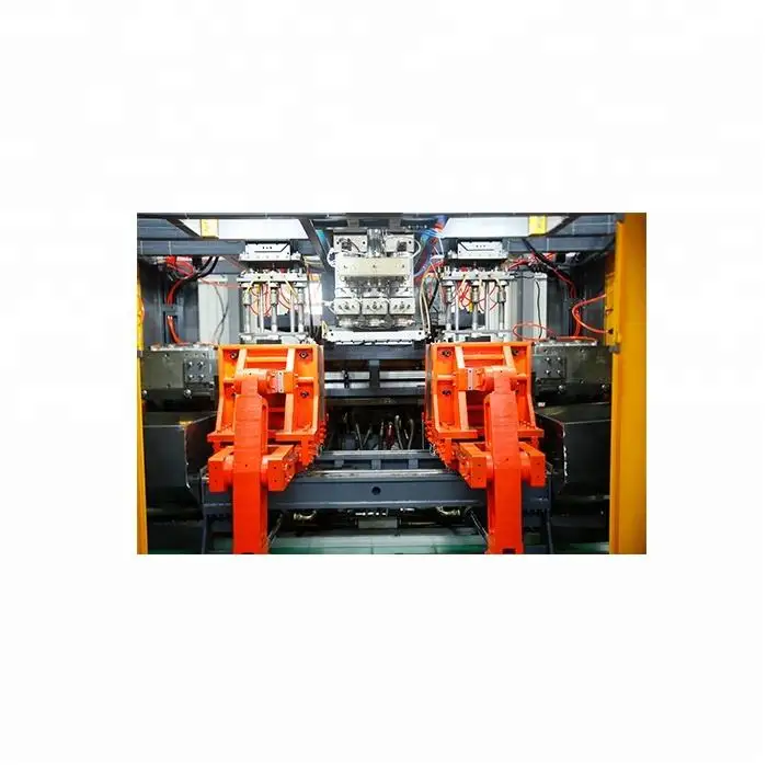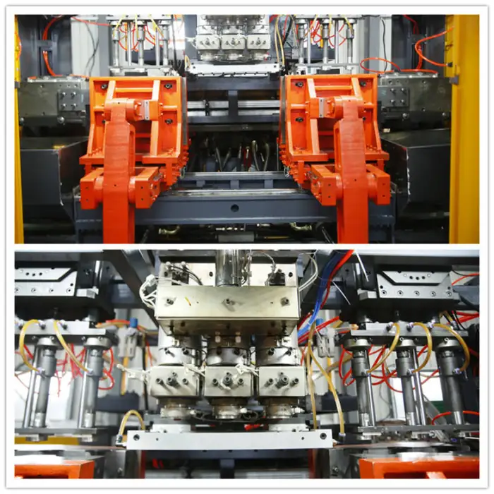 The machine includes various safety features, including emergency stop buttons, safety guards, and sensors to ensure safe operation during the blowing and molding processes.