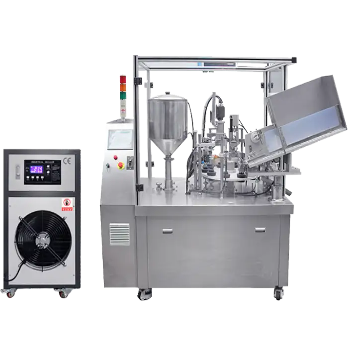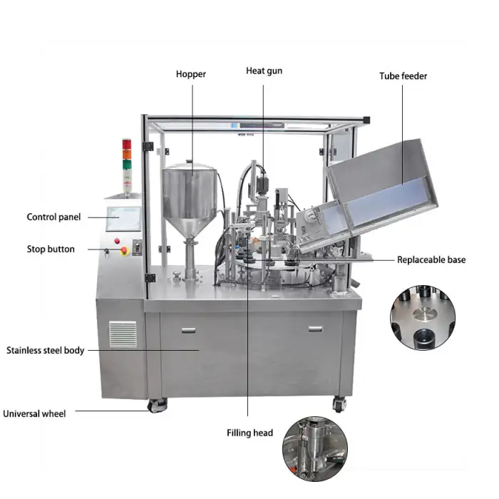 This machine is designed for filling and sealing cosmetic lotions, creams, and other similar products in plastic tubes.