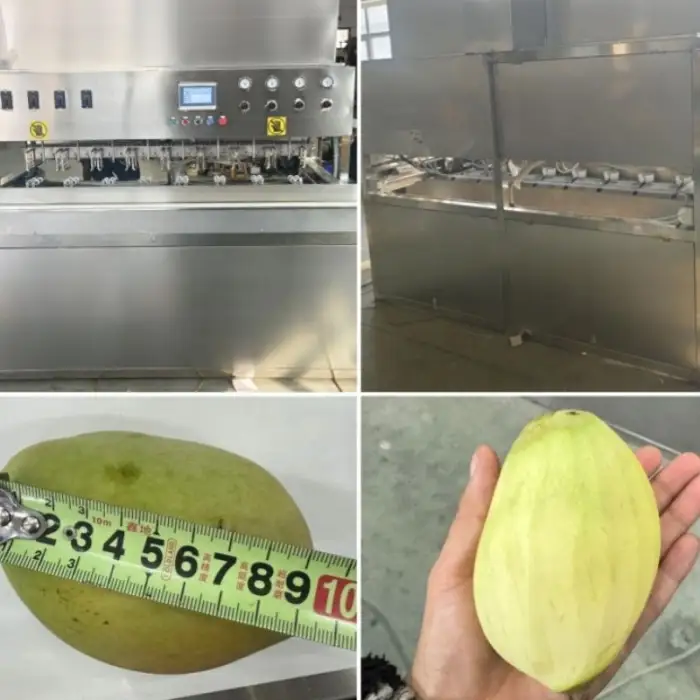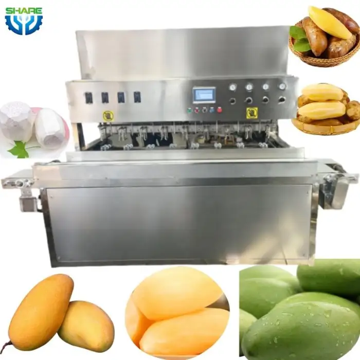 The machine is designed primarily for peeling mangoes and sweet potatoes, but it can also handle other fruits within the specified diameter and height range.