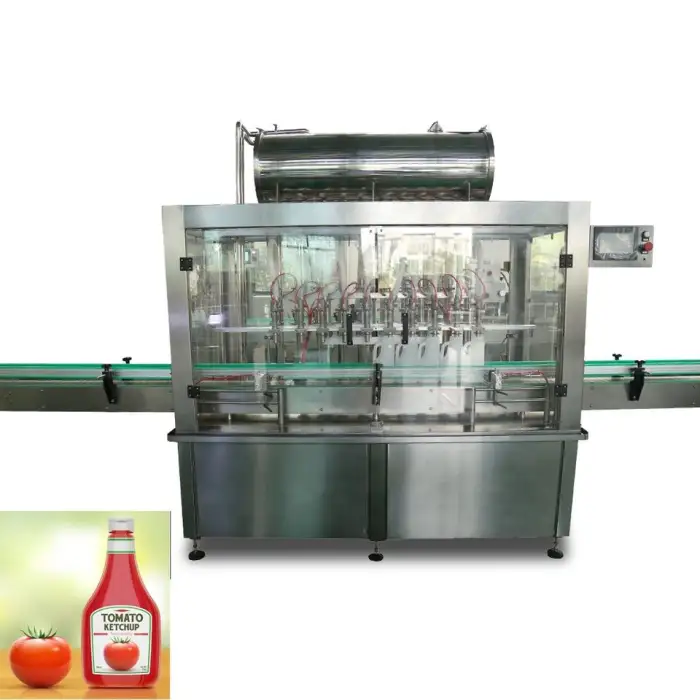 This machine is suitable for filling various products including beverages like juices and milks, sauces and pastes, as well as powders and oils.