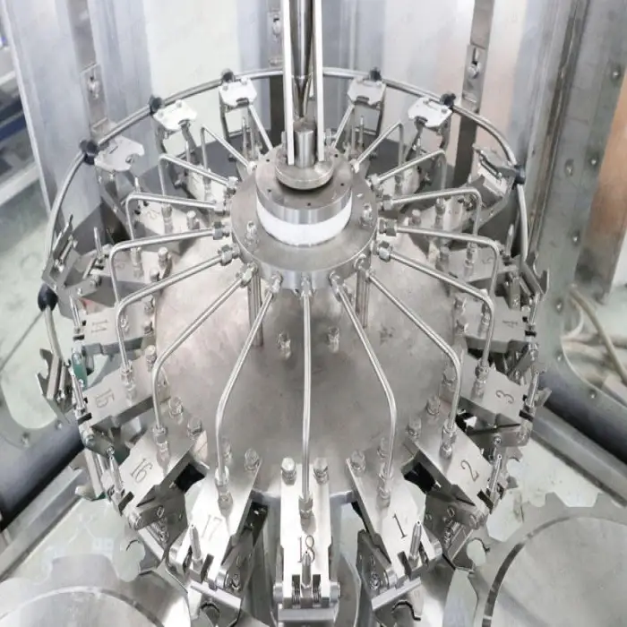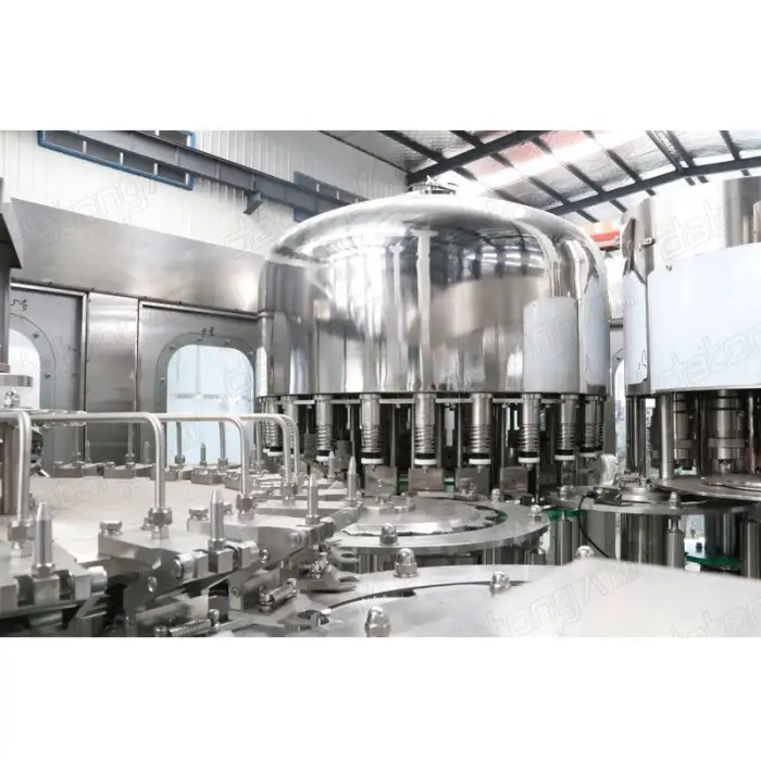 The machine performs bottle washing, filling, and capping, providing a complete solution for beverage packaging.