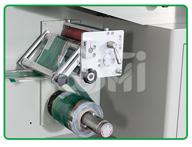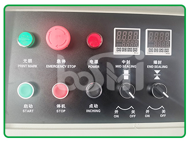 Accuracy is provided by full-servo motion control, a photoelectric eye color-tracing system, numerical cutting/seal-position input and PID temperature control for independent temperature zones. There is also a positioned-stop function to prevent knife sticking and film waste.