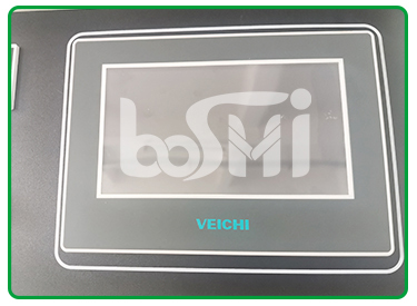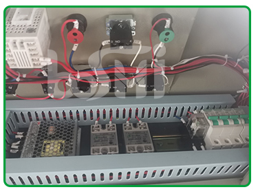 The machine features an HMI touch screen with English and Chinese displays and the option to support additional languages. Control is via PLC with a self-developed program. The panel includes start/stop, emergency stop, and temperature controls; most functions can be adjusted through software.
