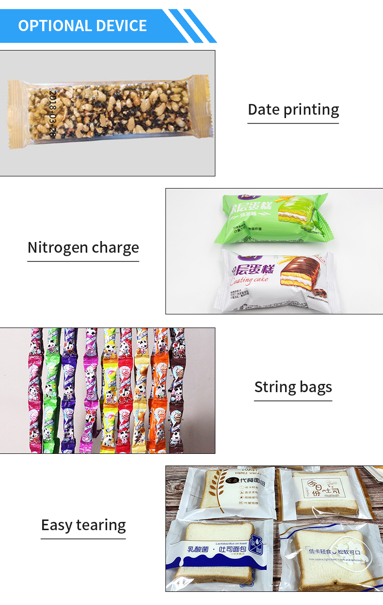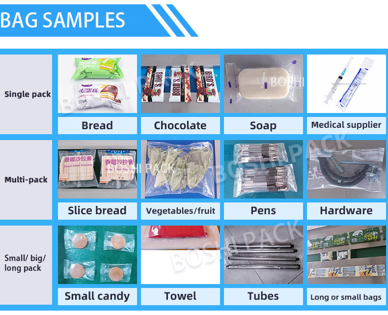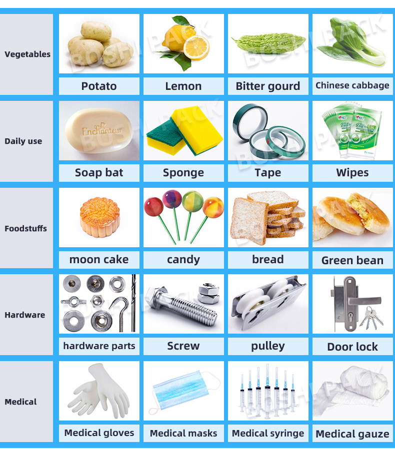 The machine is multi-functional and designed for food (bread, biscuits, cakes, meat, snacks), beverages, medical (drugs, masks, gauze), chemicals, apparel (socks, diapers), hardware, daily-use items, and other solid products with regular size.