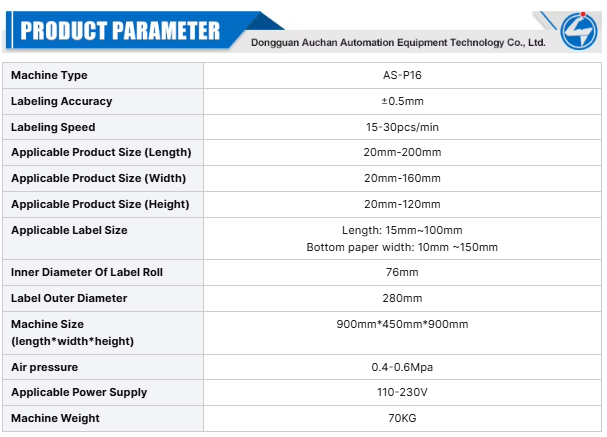 Key features include easy operation, high labeling precision, durable components, a compact design, and safe wood packaging.