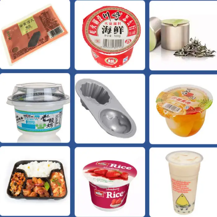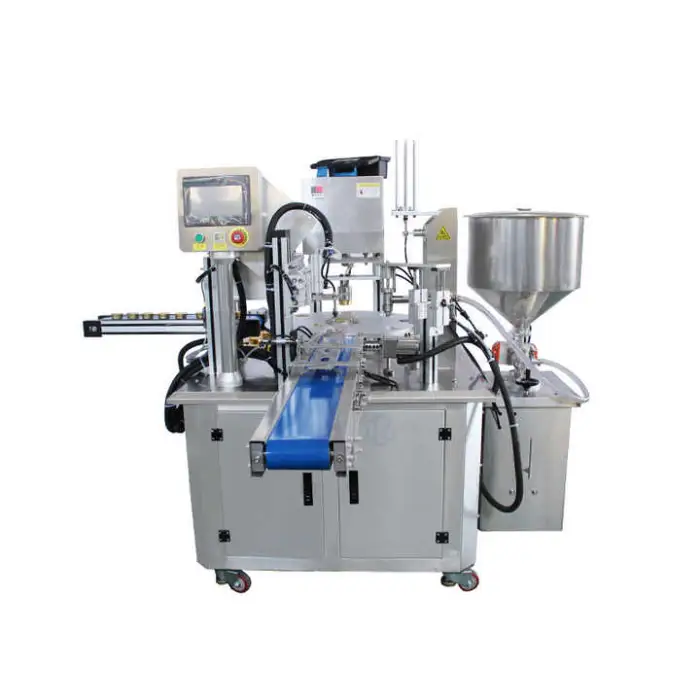 The machine is designed for filling and sealing various products, including honey, yogurt, peanut butter, jam, and jelly in plastic cups.