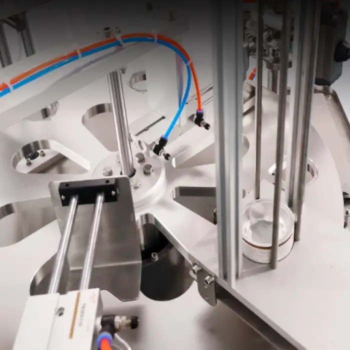 The main functions include weighing, forming, filling, sealing, and capping of the products in plastic cups.