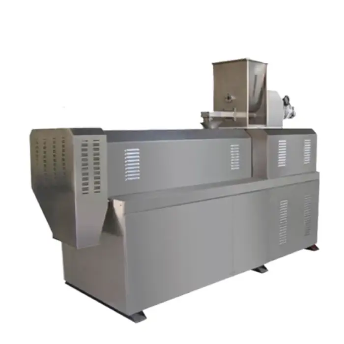 The twin screw extruder operates by mixing and cooking the feed ingredients under high temperature and pressure, which enhances the feed's digestibility and nutritional value.