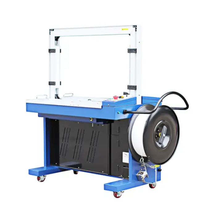 The machine can use various strapping materials suitable for different types of packaging, including plastic and polypropylene straps.