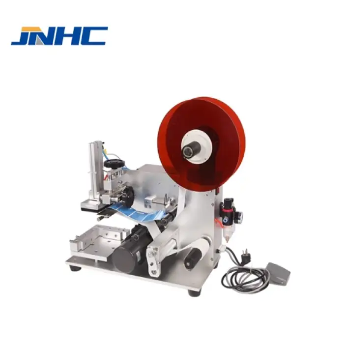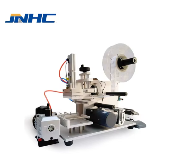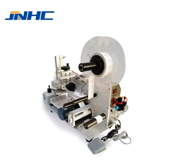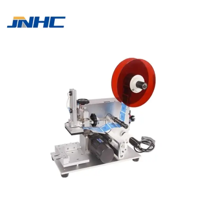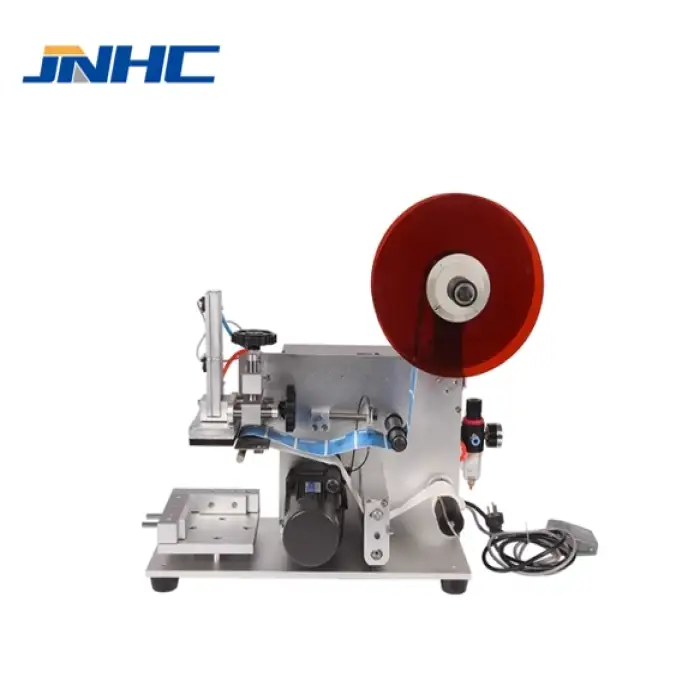 The Semi-Automatic Tabletop Plastic Bags Boxes Label Applicator is versatile and can handle round bottles, jars, and cans, including flat bottles and square jars.