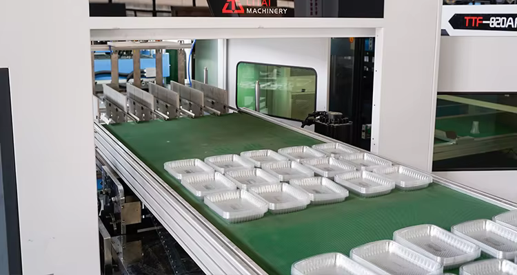 The machine uses an individual mold cutting method to create precise and uniform container shapes.