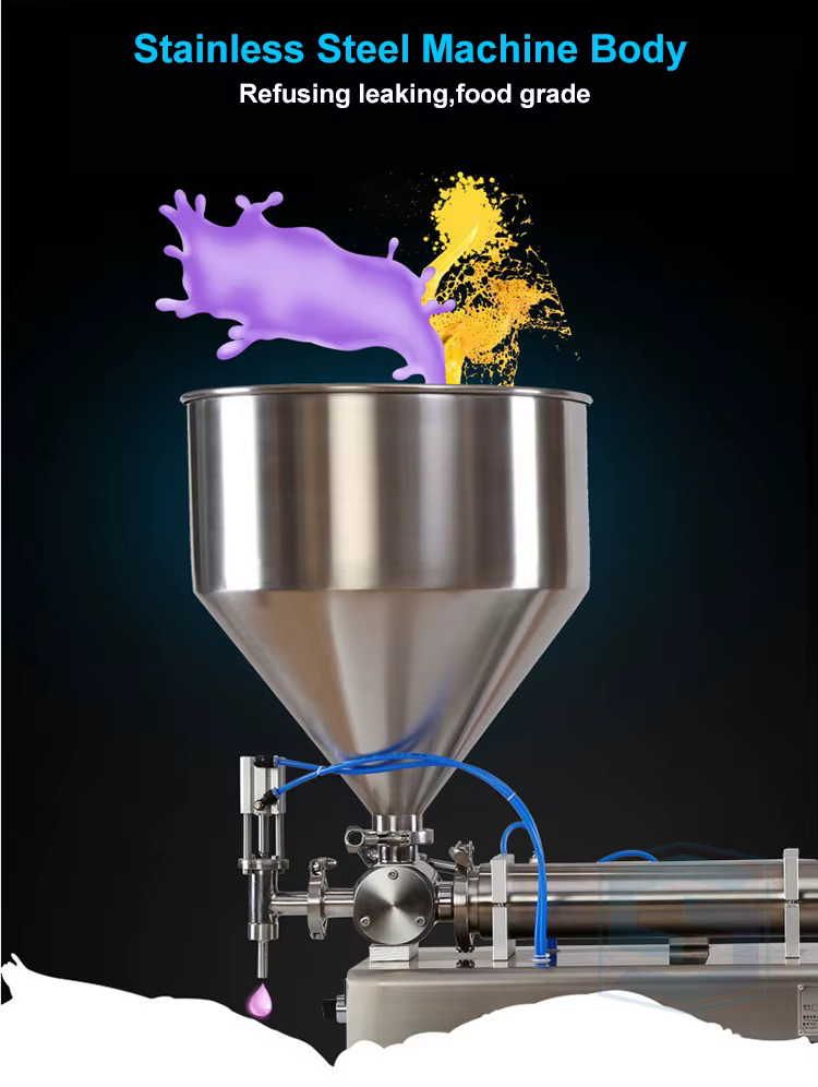 The machine can fill various liquids including olive oil, cooking oil, ketchup, honey, and other viscous liquids.