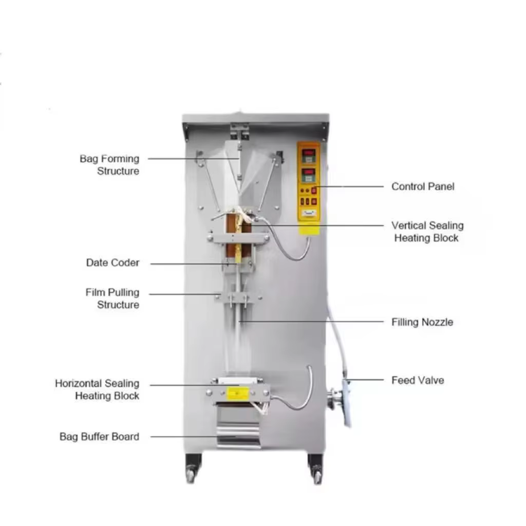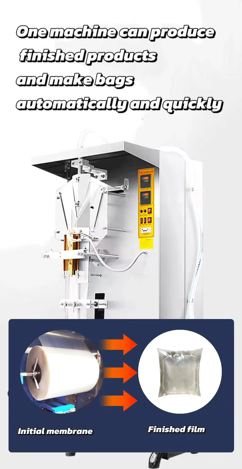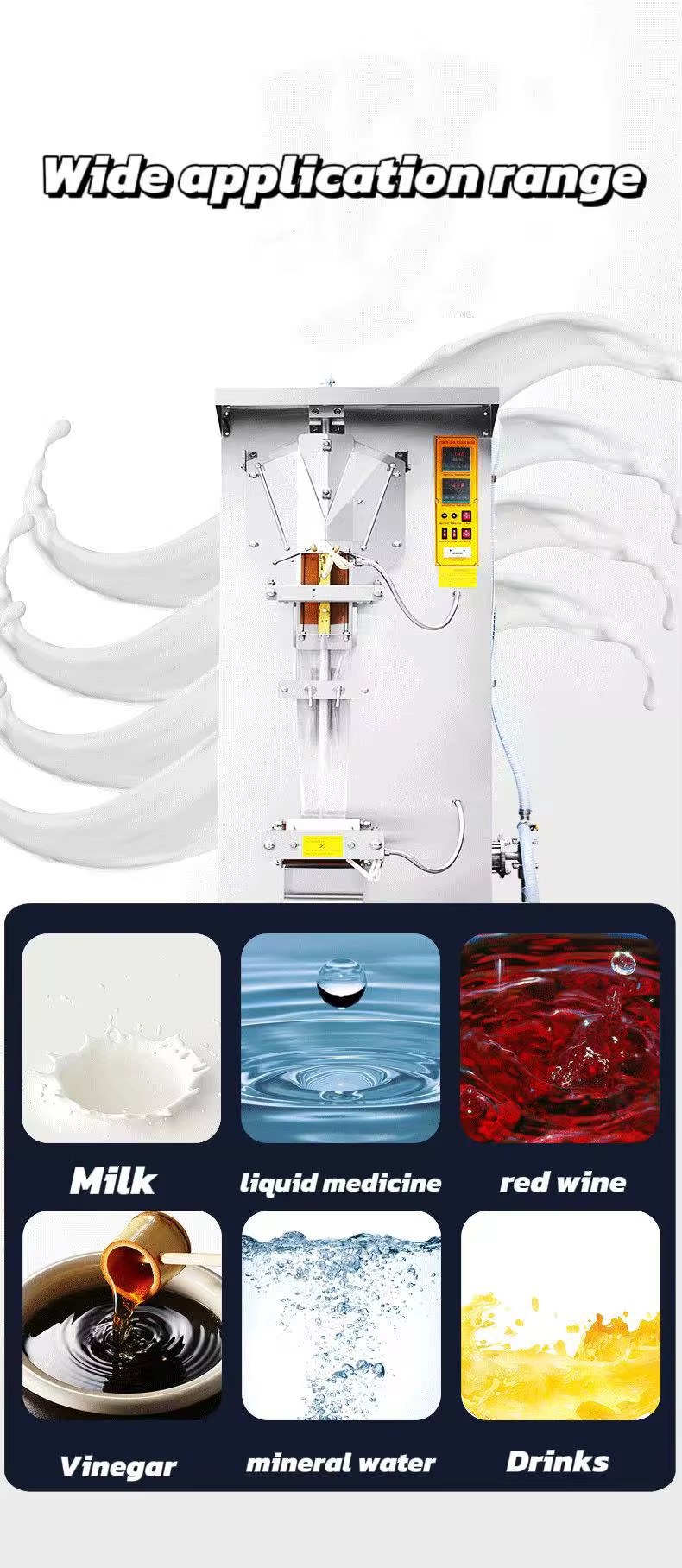The Small Fully Automatic Vertical Bagged Liquid Product Packaging Production Filling Machine is suitable for filling various liquid products, including beverages like water and milk, as well as other liquid products in the food industry.